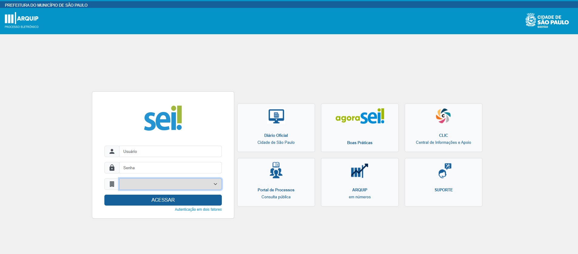 Para os servidores públicos municipais, o acesso ao SEI é realizado por meio de uma plataforma web, mediante uso de login e senha, que são disponibilizados após solicitação do superior imediato do administrador local da respectiva unidade.